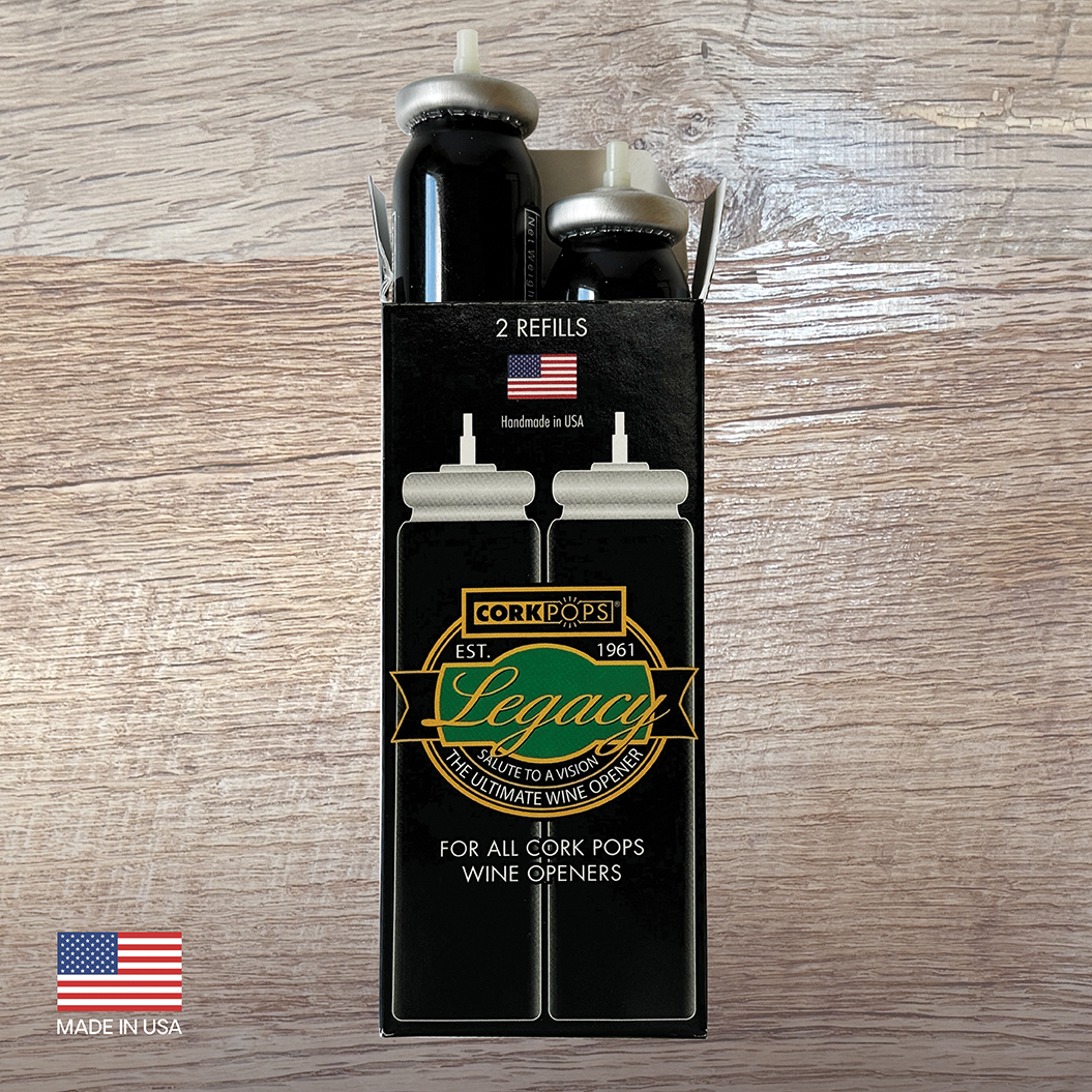 The Cork Pops Refill Cartridges are packaged two refills per box so you can enjoy your Cork Pops Wine Opener over and over. Each Cork Pop Refill Cartridge will open approximately 60 - 80 bottles of wine before requiring replacement. The refill cartridges fit all cork pops models, and utilize an environmentally safe, low-pressure inert propellant that does not affect the flavor or bouquet of any wine and has no effect on the atmosphere or ozone layer.
